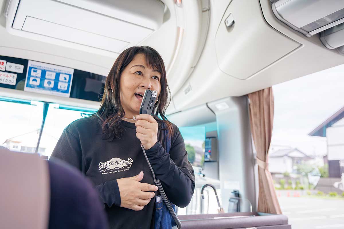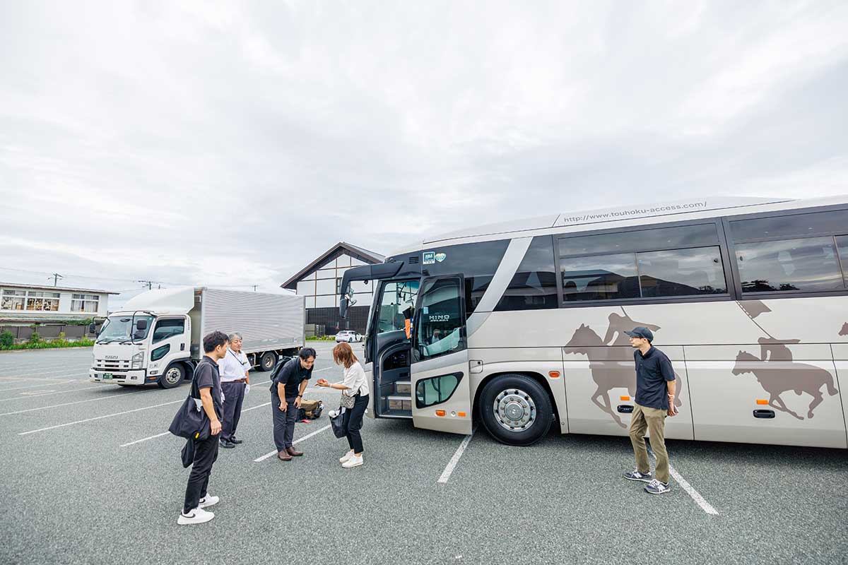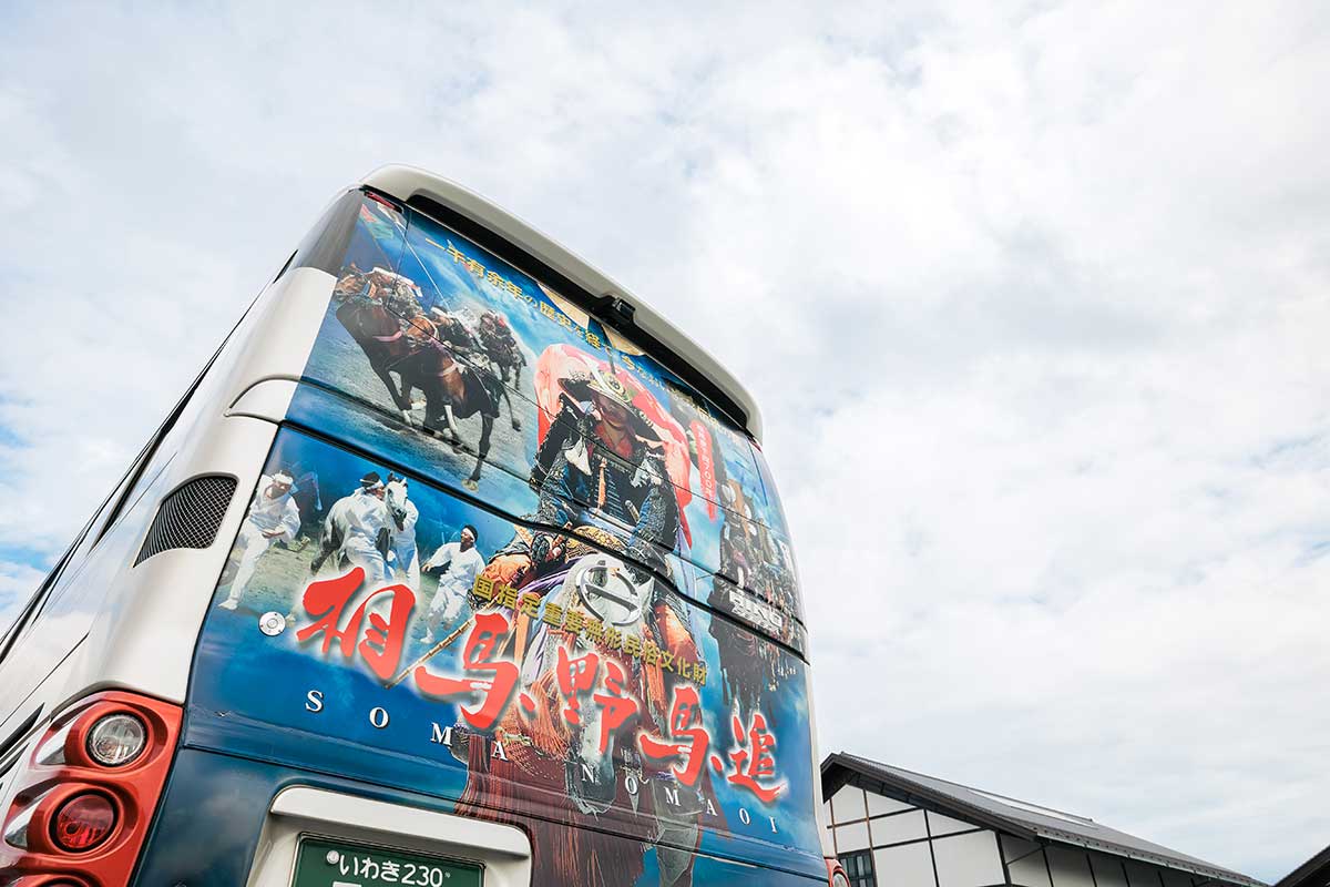 相馬名物「相馬野馬追」のラッピングバスに乗りこんで、さあ出発! 今日のツアー案内を聞きながら、海に向かって移動します。