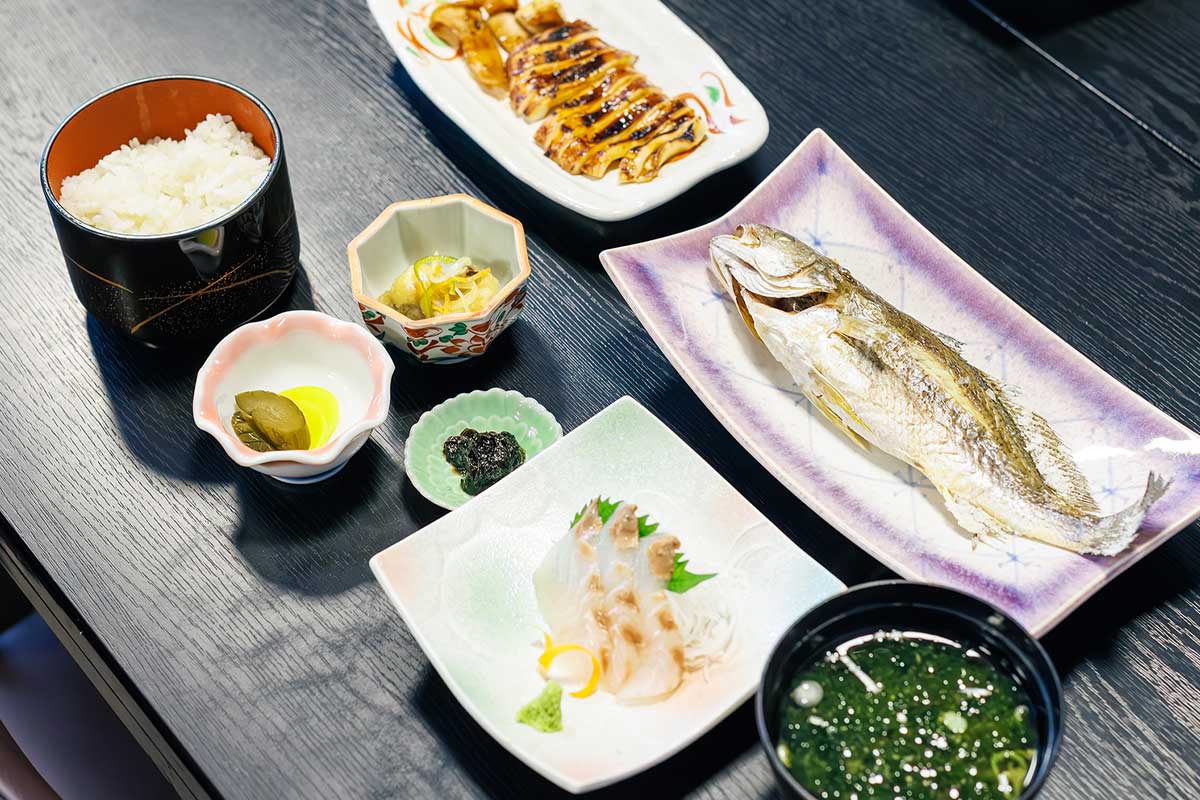 お刺身、焼き魚、イカ焼き、あおさの味噌汁…その日に水揚げされた新鮮な海の幸は、どれも美味!
