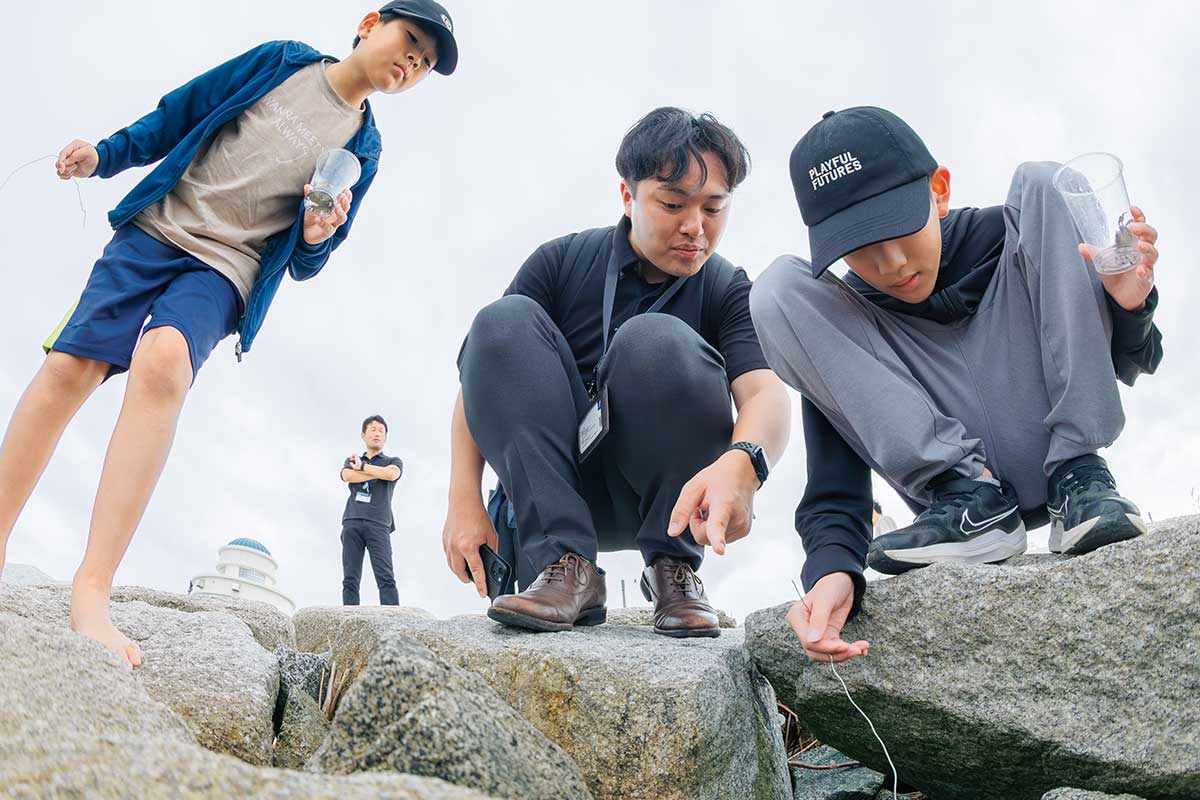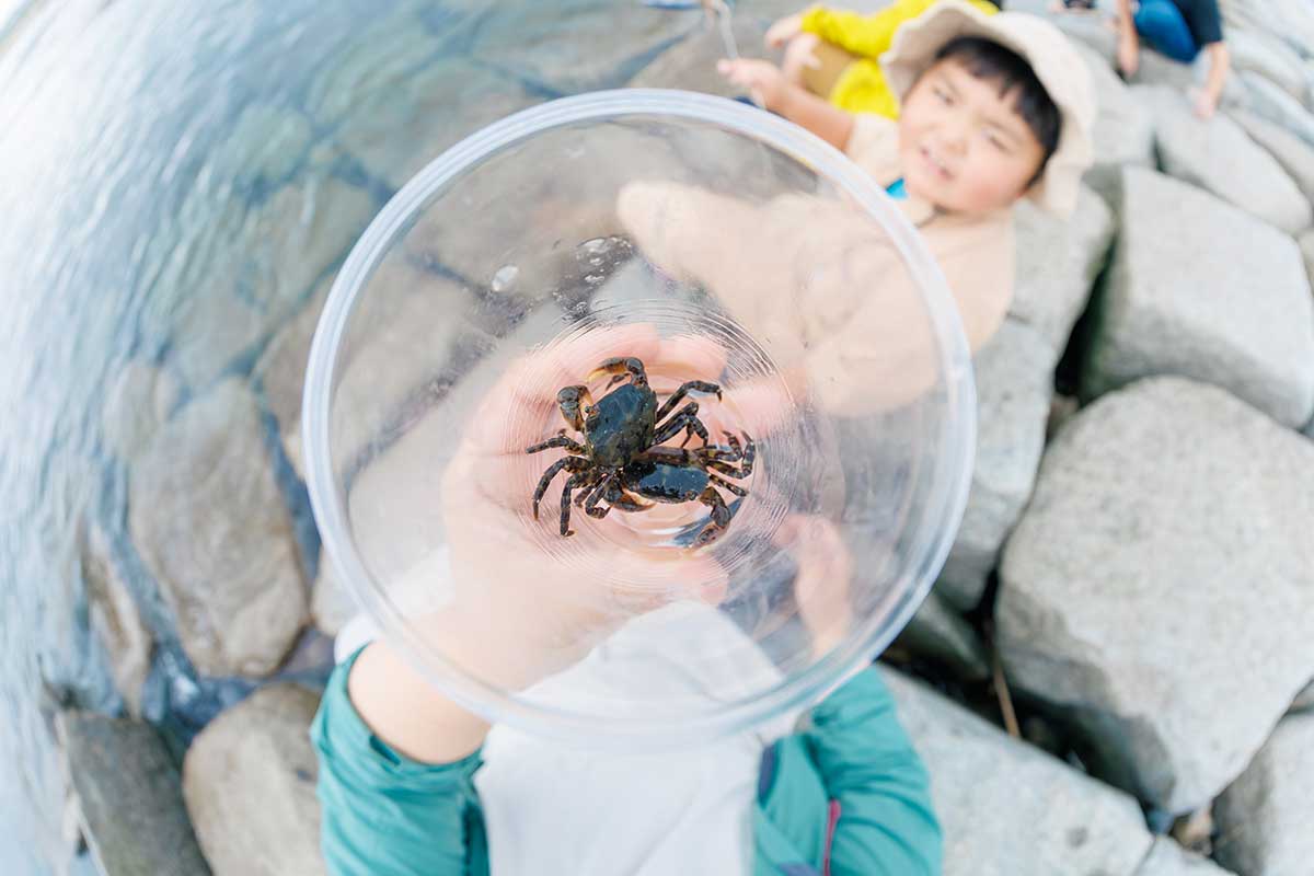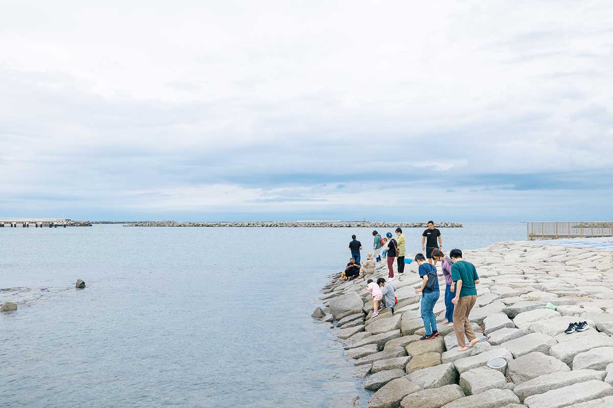 松川浦ガイドの会からやってきたカニ釣り名人がお出迎え。カニの種類や釣り方のコツについて、軽快なトークでレクチャーしてくれます。岩の隙間に針金を垂らして、じっと待ちます。なかなか釣れなかったり、どんどん釣れたり、気づけばみんな夢中!意外とコツがいるので、見た目以上の面白さです。 釣れたカニを見比べて、雄雌の見分け方や泳ぎ方を学べるのも楽しいポイント。 「楽しかった!」「道具もシンプルだし、また自分たちだけでもやりたいね」との声が続出!笑顔で海岸を後にしました。