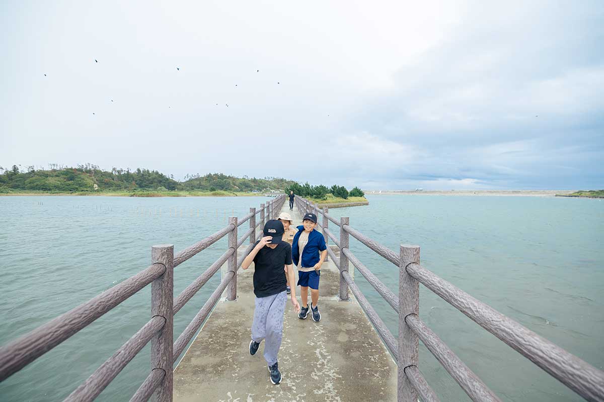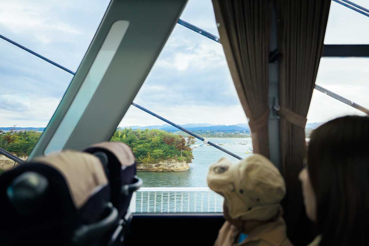 浜の駅から海沿いを東へ走っていくと、橋の上から松川浦と太平洋を両側に一望できます。車窓からの景色が気持ちいい! 松川浦に向かって一直線にのびる桟橋からは、点在する小島が見渡せます。この日は曇りでしたが、晴れると夕日がとても美しいスポットです。